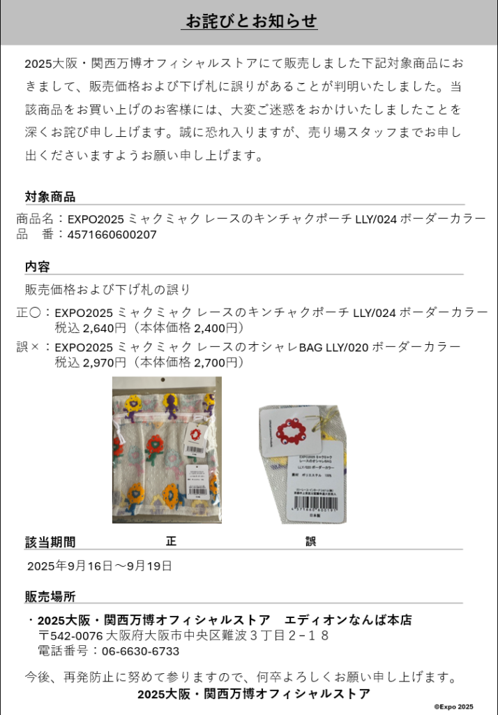 2025大阪・関西万博オフィシャルストアにて販売しました下記対象商品におきまして、販売価格および下げ札に誤りがあることが判明いたしました。
